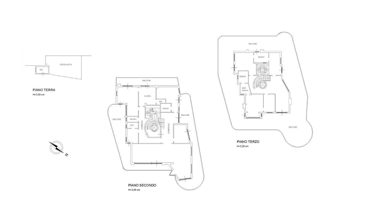 La terza unità, di circa 450 mq, anch'essa distribuita su più livelli, presenta al piano terra un ripostiglio di servizio. Al secondo piano si sviluppa la zona principale, caratterizzata da doppio ingresso su ampi disimpegni, un grande salone, cucina collegata alla zona pranzo, bagno ospiti, studio, due camere e doppi servizi, oltre a balconi per un totale di 160 mq. Il piano terzo è dedicato alla zona notte, con soggiorno, quattro camere da letto, doppi servizi e un ampio balcone perimetrale di 297 mq che abbraccia l'intero livello, conferendo grande luminosità e continuità visiva.